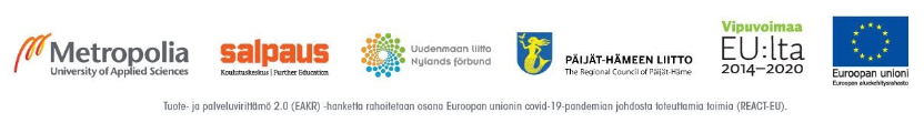 Tuote- ja palveluvirittämö 2.0 on Euroopan aluekehitysrahaston (EAKR) osarahoittama hanke, joka saa rahoitusta osana Euroopan unionin covid-19-pandemian johdosta toteuttamia toimia (REACT-EU). Metropolia Ammattikorkeakoulu ja Koulutuskeskus Salpaus toteuttavat hanketta yhteistyössä Uudenmaan ja Päijät-Hämeen alueella. Tavoitteena on yritysten innovaatiotoiminnan vahvistaminen. Hankkeen toiminta-aika on 1.6.2021 - 31.8.2023.